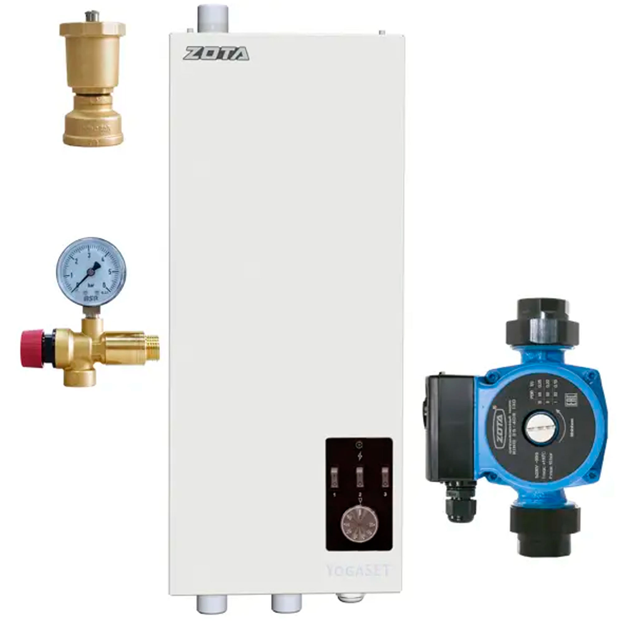 Электрический котел Zota YOGASET — больше чем электрокотел, это целая мини-котельная, предназначенная для эксплуатации в системах отопления. Сборное изделие, в состав которого входят – электрический котел, циркуляционный насос, предохранительный клапан, воздухоотводчик и манометр. Данное комплексное решение делает компактным не только сам котел, но и обвязку системы отопления в целом, что позволяет сэкономить место в помещении, и легко установить даже в небольших котельных. Котел устанавливается на стену и подключается к электросети напряжением 220/380. Одной из главных отличительных особенностей котла от всех прочих является наличие трех соединительных патрубков вместо двух, что делает котел самым уникальным на рынке с точки зрения универсальности и удобства врезки в систему отопления. Термостат с датчиком температуры теплоносителя гильзованным внутрь колбы котла обеспечивают высокую точность поддержания заданной температуры теплоносителя в диапазоне от 25 до 85 градусов. Колодка внешнего термостата позволяет эксплуатировать котел не только по температуре теплоносителя, но и по комнатной температуре – что существенно увеличит условия комфорта, а также до 30% дополнительно снизит расход электроэнергии на отопление. Модель обладает высокой надежностью. Во-первых, у котла имеется резервный самовозвратный датчик перегрева теплоносителя, срабатывающий на 95 градусах, во-вторых, установлен надежный электромагнитный пускатель на 25А, встроенный в цепь питания котла и, в-третьих, дополнительный предохранитель для защиты цепи питания котла.