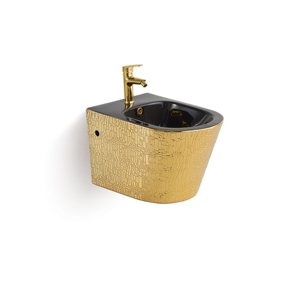 Изготовленное из прочного фарфора, биде Vincea Q-Line отличается закругленной формой и гармоничными пропорциями. Его размеры: высота 330 мм, ширина 360 мм и глубина 530 мм, что делает его удобным для использования в любом пространстве. Внешняя часть чаши покрыта золотым покрытием с текстурой, а внутренняя часть выполнена в глянцевом черном цвете, что придаёт изделию уникальный и стильный вид.