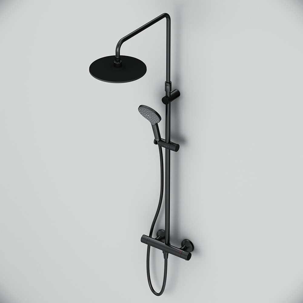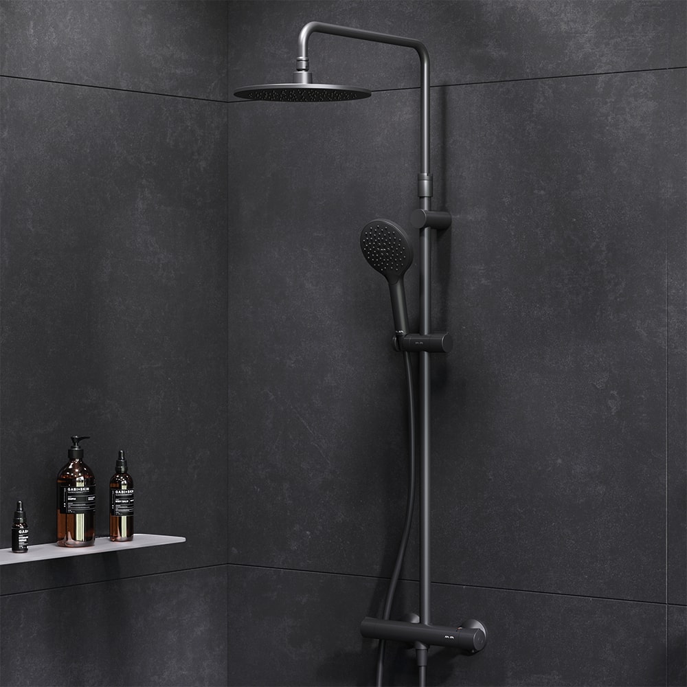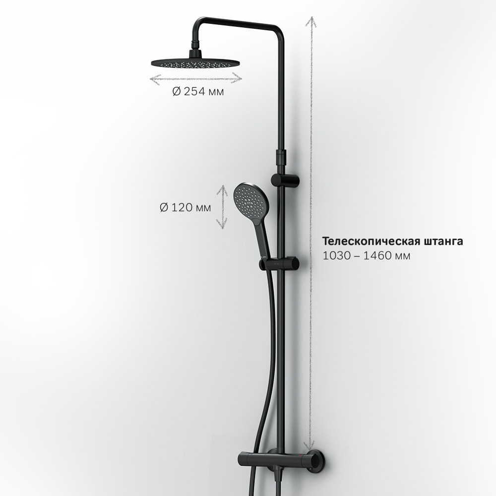 Душевая система выполнена из качественной латуни, что обеспечивает долговечность и надежность. С глубиной 552 мм, высотой 1460 мм и шириной 282 мм, она идеально впишется в любое пространство. Элегантный черный цвет добавляет нотку современности и стиля, а диаметр верхней лейки в 220 мм и ручного душа в 120 мм обеспечивают комфортное использование.