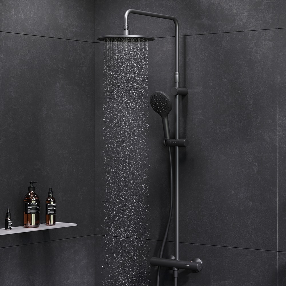 Управление душем осуществляется с помощью термостата, что позволяет легко и быстро настраивать нужную температуру. Штанга душевой стойки регулируется по высоте в диапазоне от 1030 до 1460 мм, что обеспечивает комфорт для людей любого роста. Шаровый шарнир в держателе верхнего душа позволяет регулировать угол его наклона, что добавляет удобства в использовании.