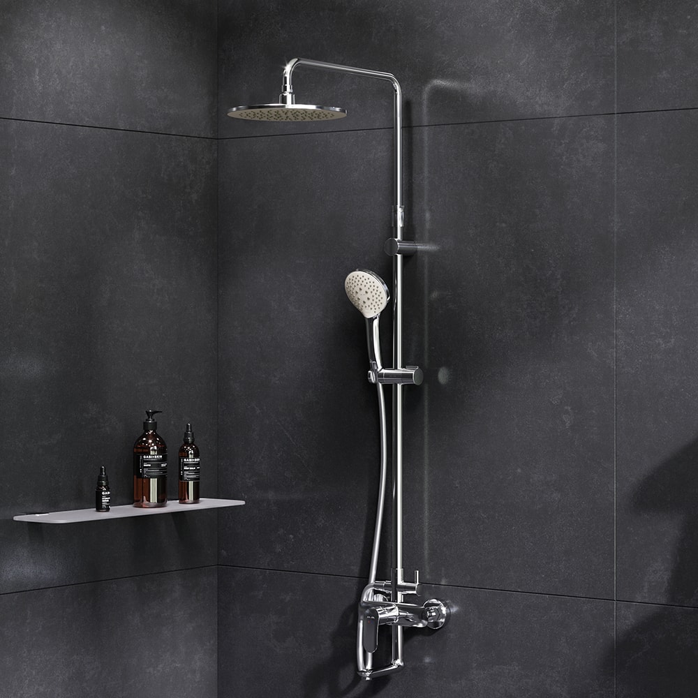 Эта душевая стойка выполнена из высококачественных материалов, таких как ПВХ, ABS-пластик, нержавеющая сталь и латунь, что гарантирует долговечность и надежность. Телескопическая поворотная штанга регулируется по высоте в диапазоне от 1030 до 1460 мм, что позволяет настроить систему под любой рост пользователя.