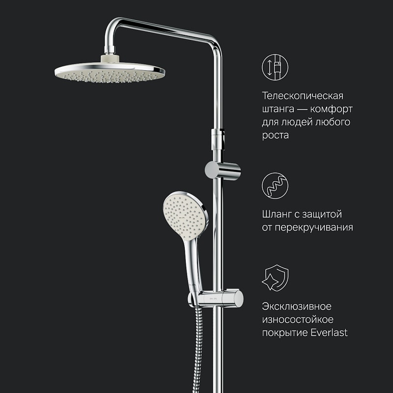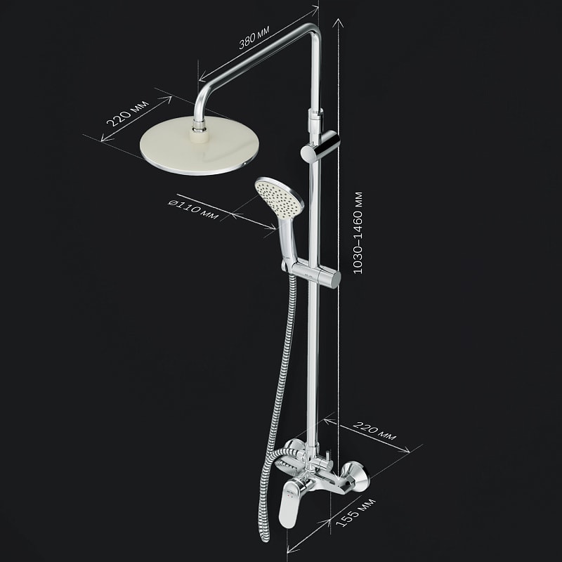 Диаметр душевых леек составляет 220 мм для верхнего душа и 110 мм для ручного, что позволяет ощутить преимущества тропического душа даже в стандартной ванной. Увеличенная длина шланга в 1750 мм обеспечивает свободу движений во время принятия душа, а телескопическая поворотная штанга, регулируемая по высоте от 1030 до 1460 мм, гарантирует комфорт для людей любого роста.