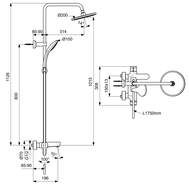 Пластиковый верхний душ диаметром 200 мм с ограничением потока 12 л/мин и душевая лейка 100 мм с ограничением потока 8 л/мин обеспечивают комфортный и экономичный душ. Шланг Idealflex длиной 1750 мм и обратный клапан добавляют функциональности и удобства в использовании.