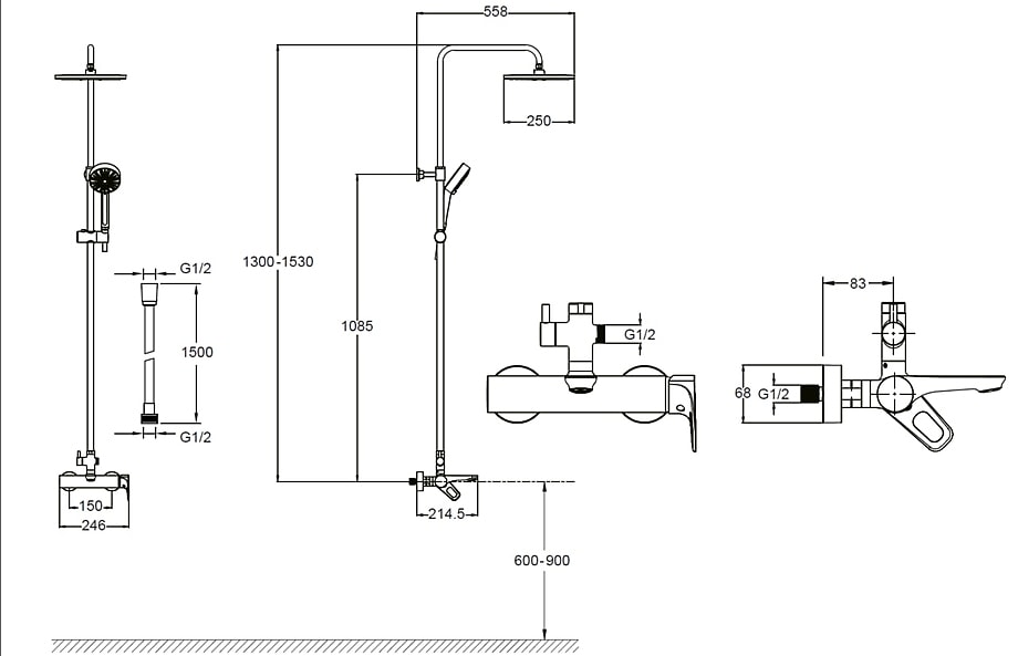Душевая система выполнена из качественной латуни, что обеспечивает долговечность и надежность. Высота системы составляет 1530 мм, ширина – 250 мм, а глубина – 558 мм. Она идеально впишется в любое пространство, добавляя элегантности и современности.