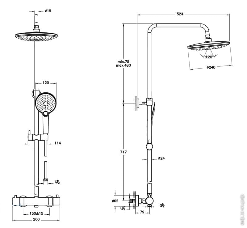 Душевая система выполнена из прочной латуни, что обеспечивает долговечность и надежность в эксплуатации. С размерами 524 мм в глубину, 1228 мм в высоту и 268 мм в ширину, она идеально впишется в пространство вашей ванной. Диаметр лейки составляет 240 мм, что гарантирует комфортное и приятное использование.