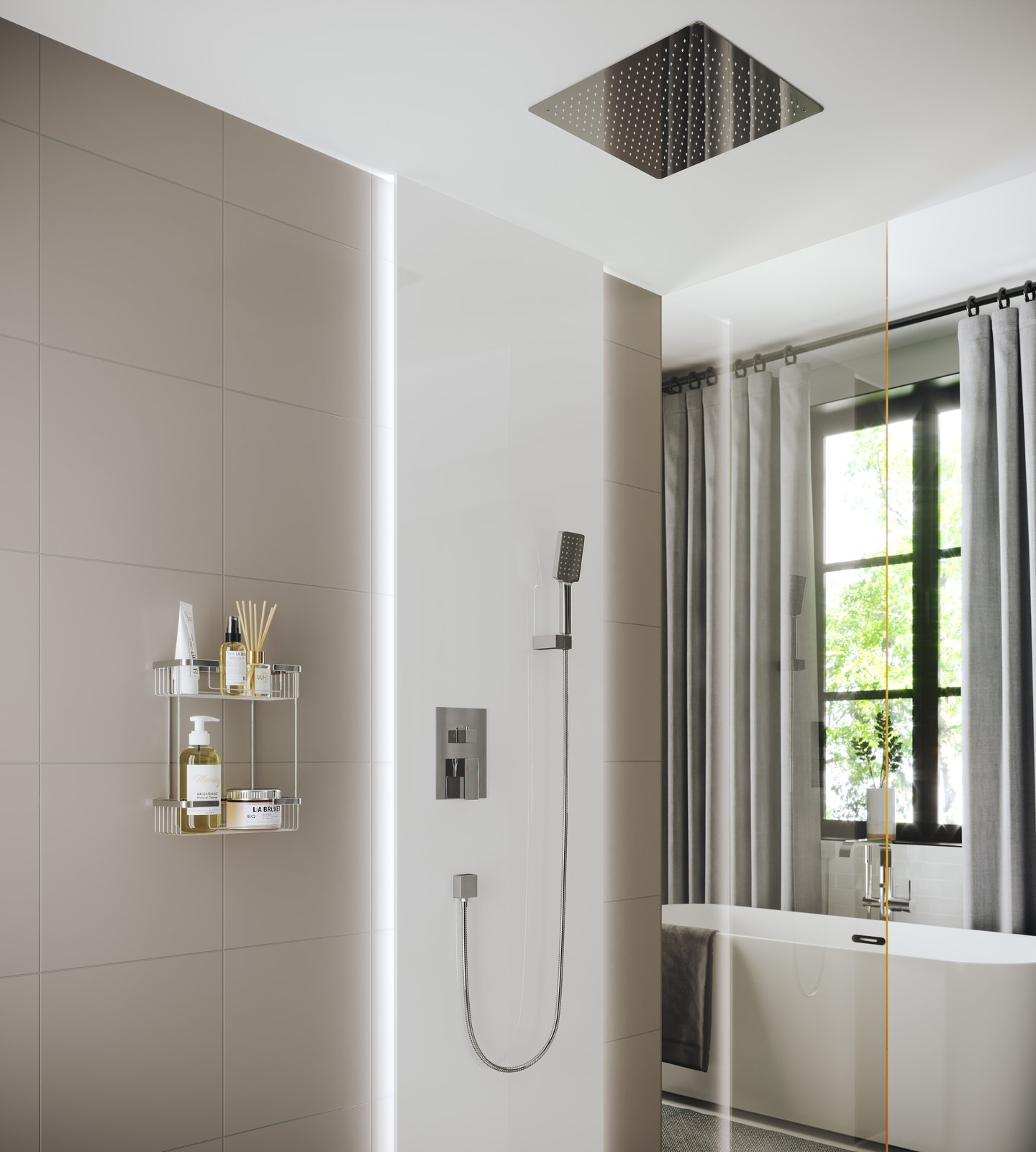 Управление душевой системой осуществляется с помощью удобного рычажного смесителя, который позволяет легко регулировать напор и температуру воды. Переключение между режимами "тропический душ" и "ручной душ" осуществляется простым поворотом ручки дивертора, что делает использование системы максимально комфортным.