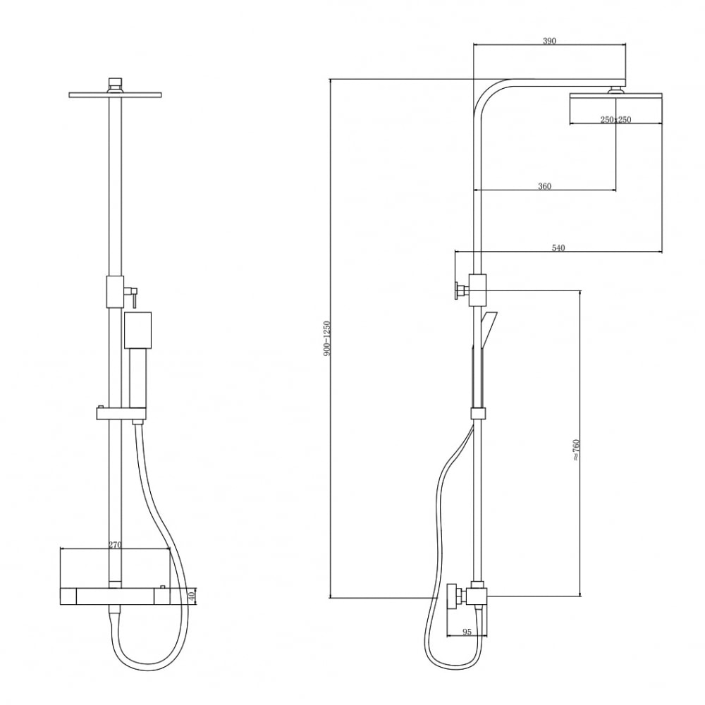 Душевая стойка изготовлена из высококачественной латуни, что гарантирует долговечность и надежность. Благодаря технологии цельной отливки при атмосферном давлении, изделие обладает высокой прочностью и устойчивостью к перепадам давления. Размеры стойки составляют 1250 мм в высоту, 270 мм в ширину и 500 мм в глубину, что делает ее универсальным решением для различных интерьеров.