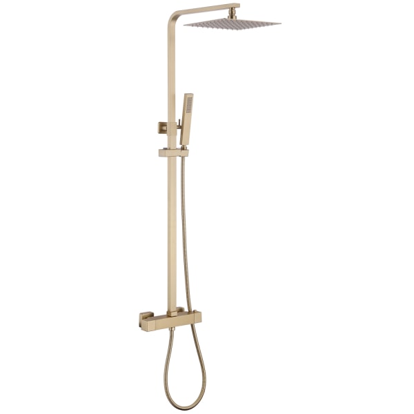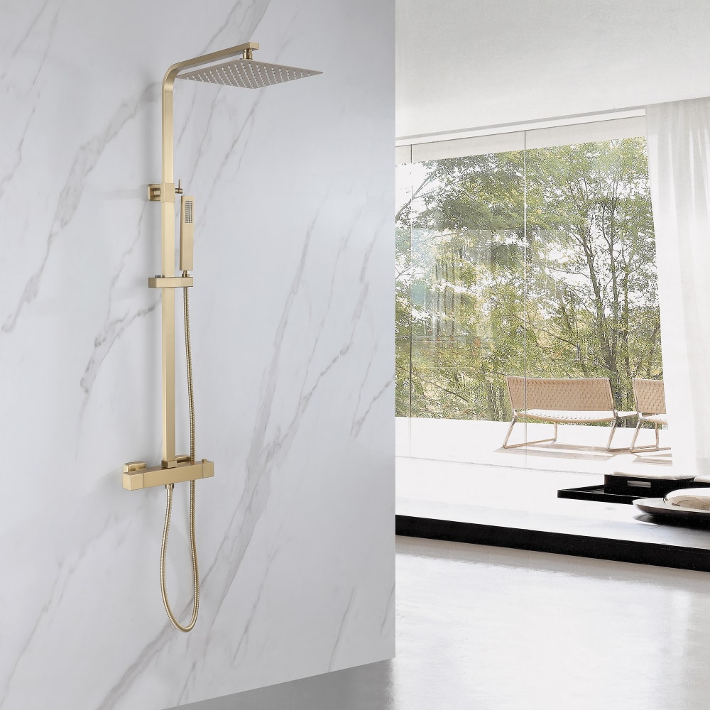 Душевая стойка выполнена из качественных материалов: латунь, нержавеющая сталь и ABS-пластик обеспечивают долговечность и надежность. Матовый золотой цвет придаст вашей ванной комнате роскошный вид, а термостат позволит точно регулировать температуру воды, что обеспечит максимальный комфорт во время принятия душа.