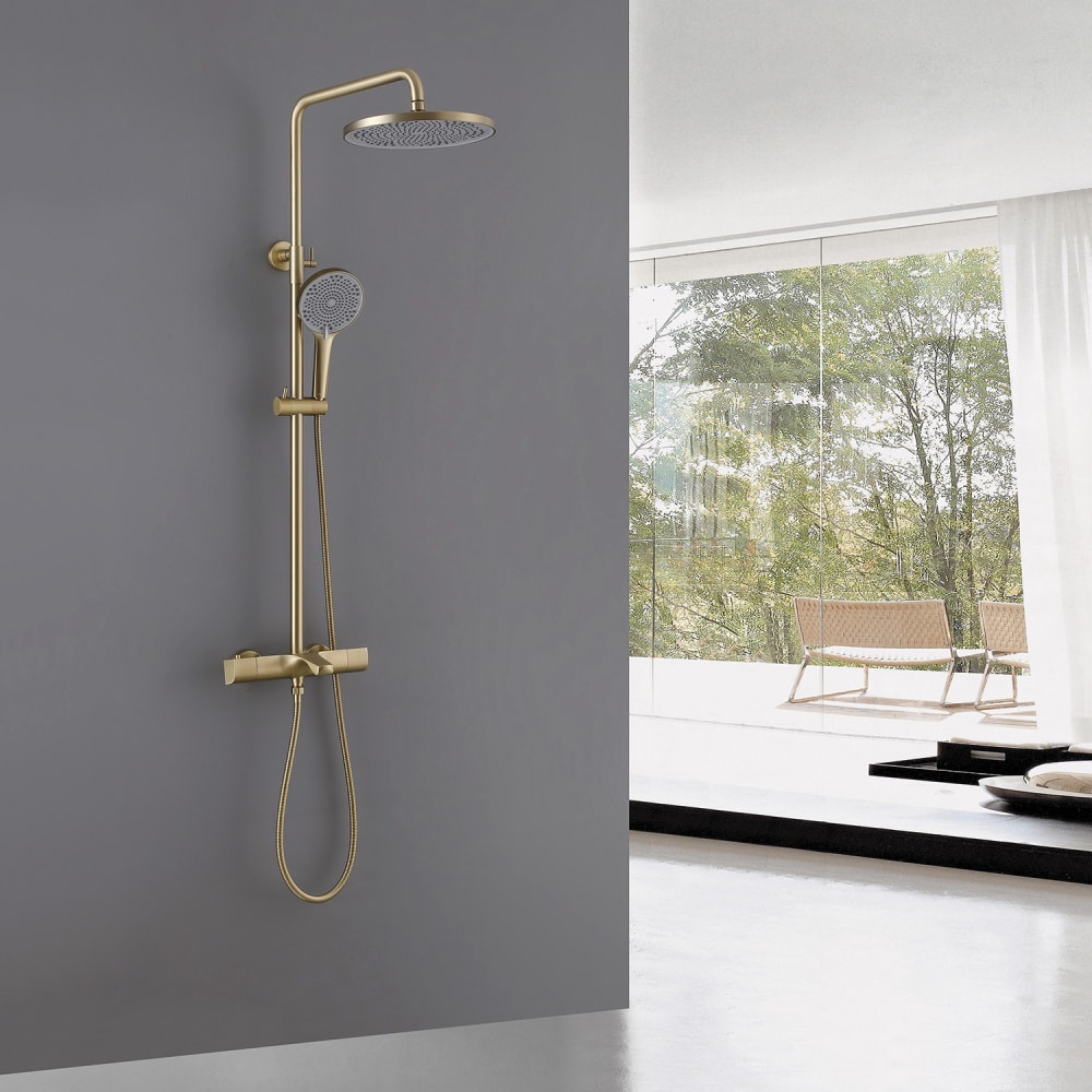 Смеситель, входящий в комплект, управляется с помощью термостата, что обеспечивает комфортную и безопасную температуру воды. Технология PVD для нанесения покрытия матового золота обеспечивает высокую износостойкость и устойчивость к коррозии, что делает эту душевую стойку идеальным выбором для долгосрочного использования.