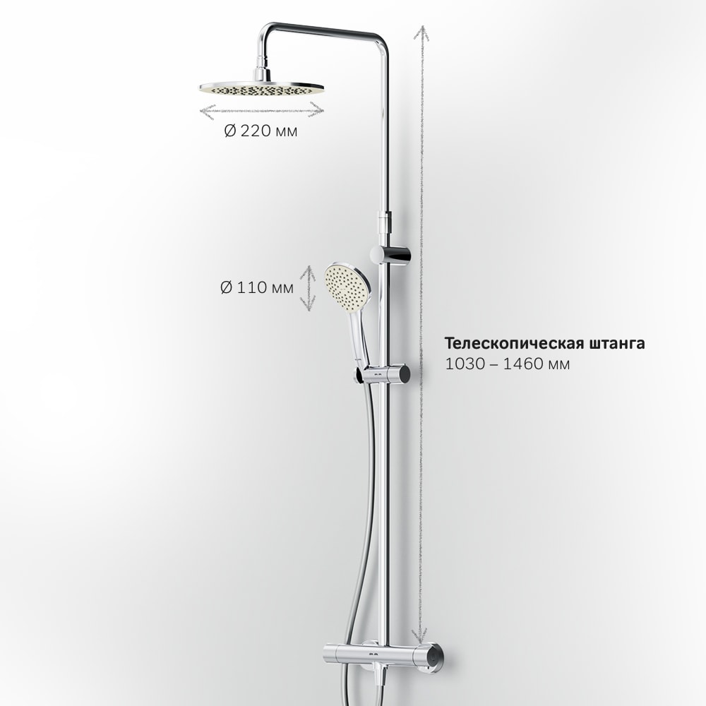 Одной из ключевых особенностей данной модели является продуманный дизайн, который обеспечивает максимальный комфорт при использовании. Штанга регулируется по высоте в диапазоне от 1030 до 1460 мм, что позволяет настроить её под рост каждого члена семьи. Шаровый шарнир в держателе верхнего душа позволяет легко регулировать угол наклона, обеспечивая оптимальный поток воды.