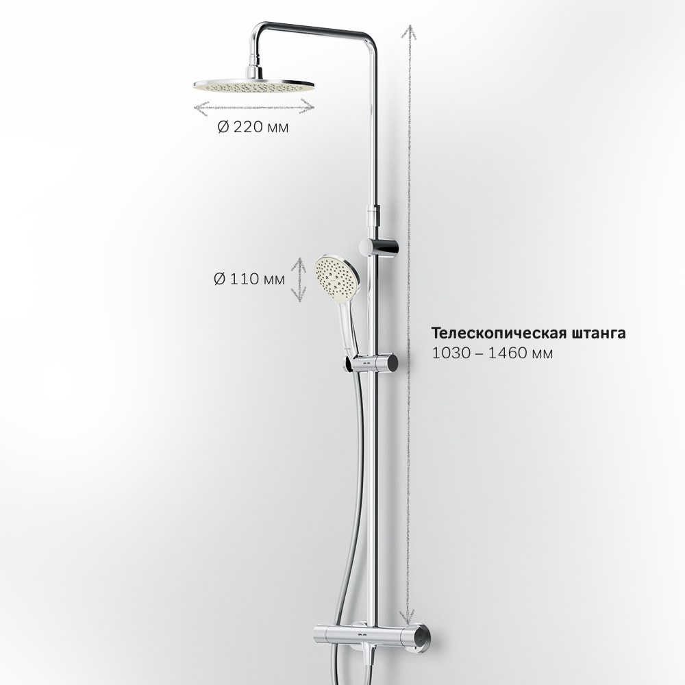 С размерами 1460 мм в высоту, 282 мм в ширину и 552 мм в глубину, эта душевая стойка идеально подходит для ванных комнат любого размера. Регулируемая штанга позволяет настроить высоту от 1030 до 1460 мм, что делает её удобной для людей любого роста. Шаровый шарнир в держателе верхнего душа обеспечивает возможность регулировки угла наклона, что добавляет удобства в использовании.