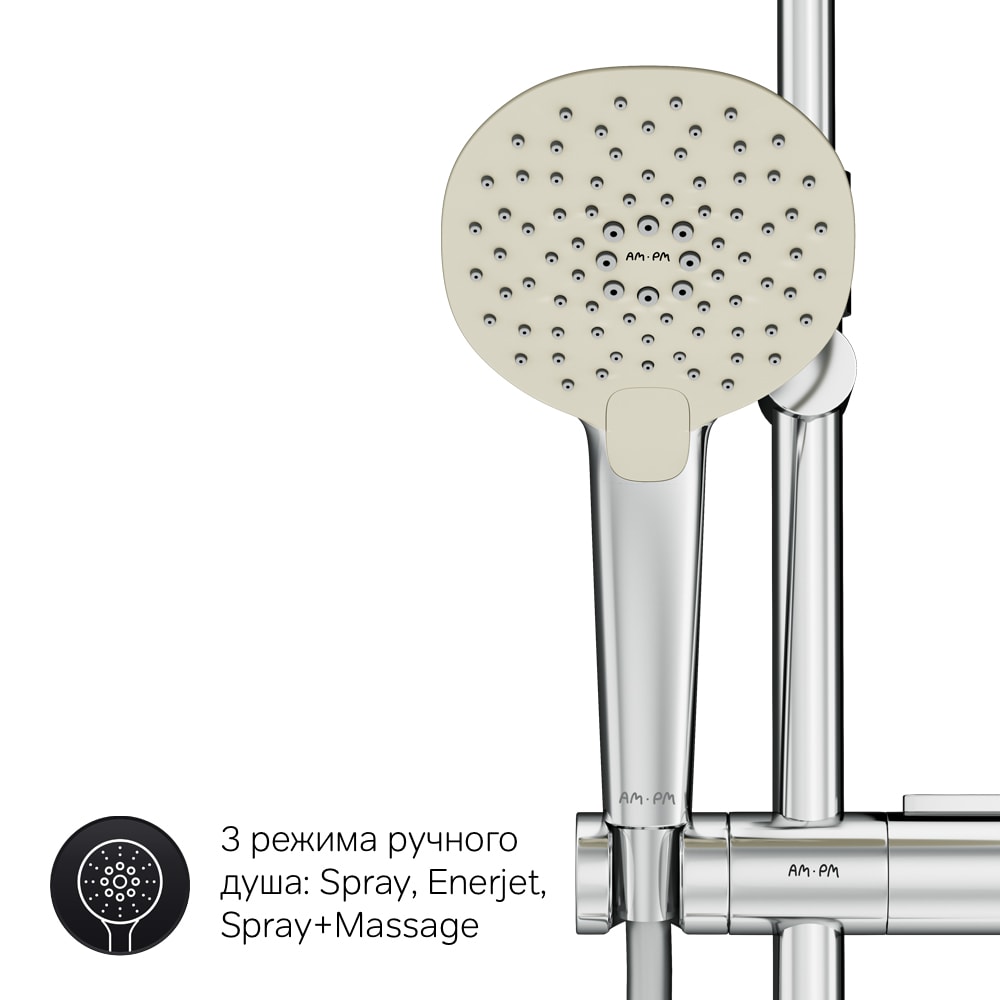 Душевая стойка AM.PM Spirit 2.0 предлагает три режима ручного душа: Spray, EnerJet и Spray + Massage. Переключение между режимами осуществляется с помощью простого переключателя Simple Switch Push, а функция Rub&Clean позволяет легко очищать душевые форсунки от налета.