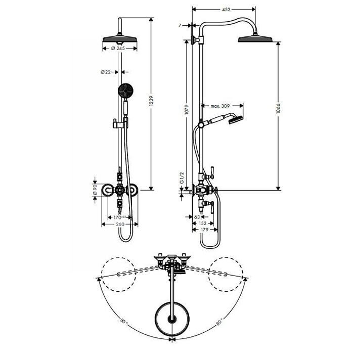 Душевая стойка выполнена из качественной латуни и имеет хромированное покрытие, что обеспечивает долговечность и легкость в уходе. С размерами 1239 мм в высоту, 260 мм в ширину и 452 мм в глубину, она идеально впишется в пространство вашей ванной комнаты.