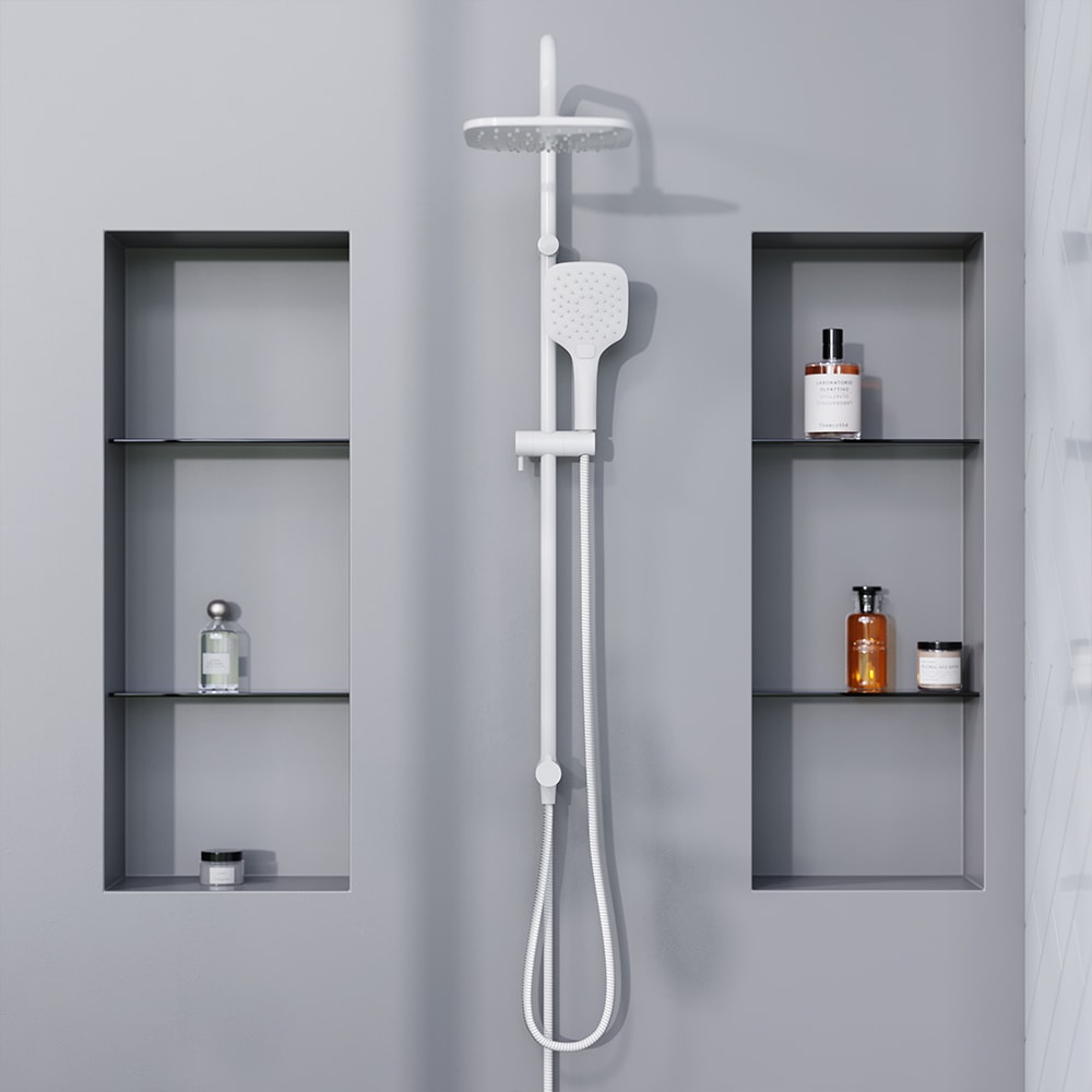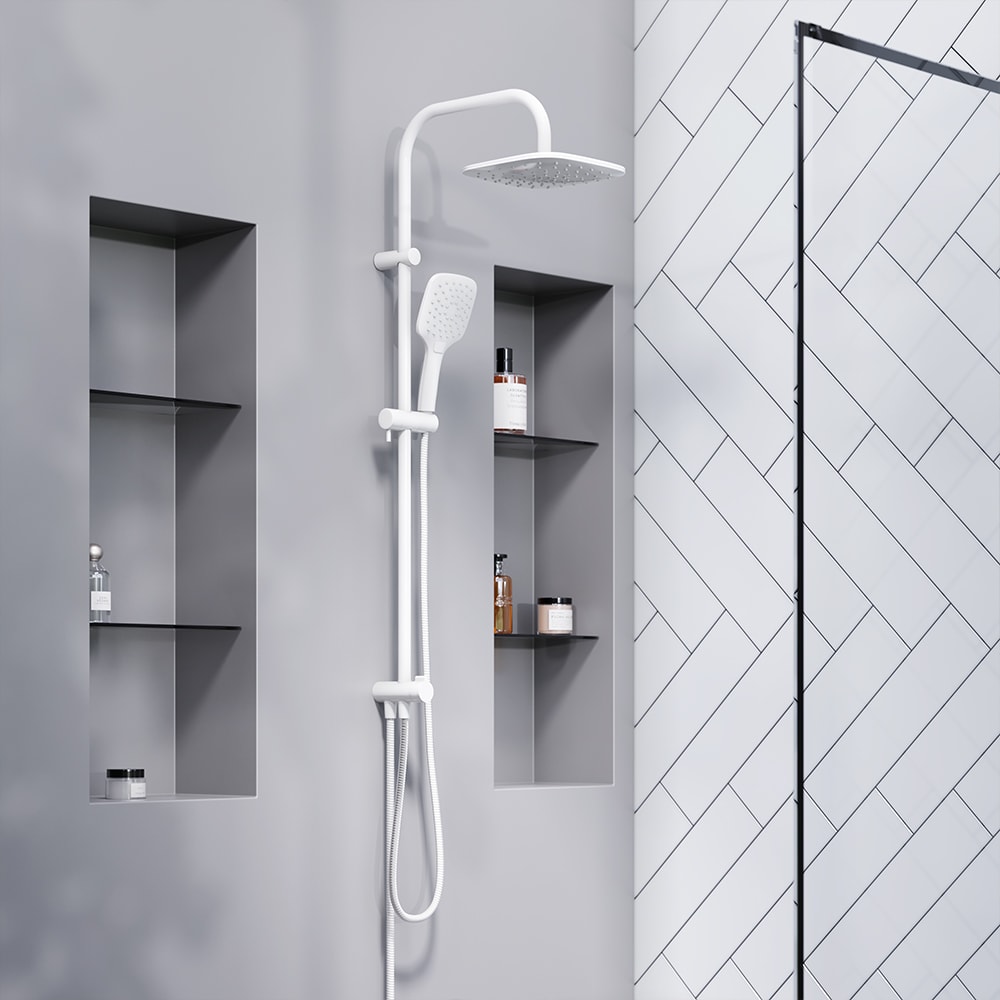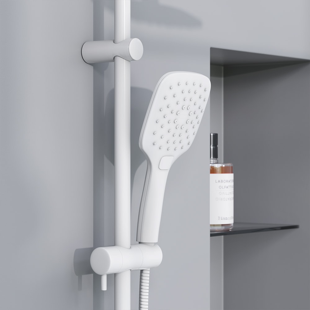 Душевая стойка выполнена из прочных материалов: сталь и пластик, что обеспечивает долговечность и надежность в эксплуатации. Белый цвет придаст вашей ванной комнате свежесть и легкость, а строгий дизайн с идеально симметричными формами и четкими гранями привлечет внимание и создаст динамику в интерьере.