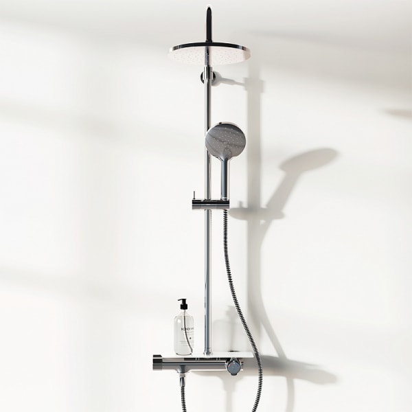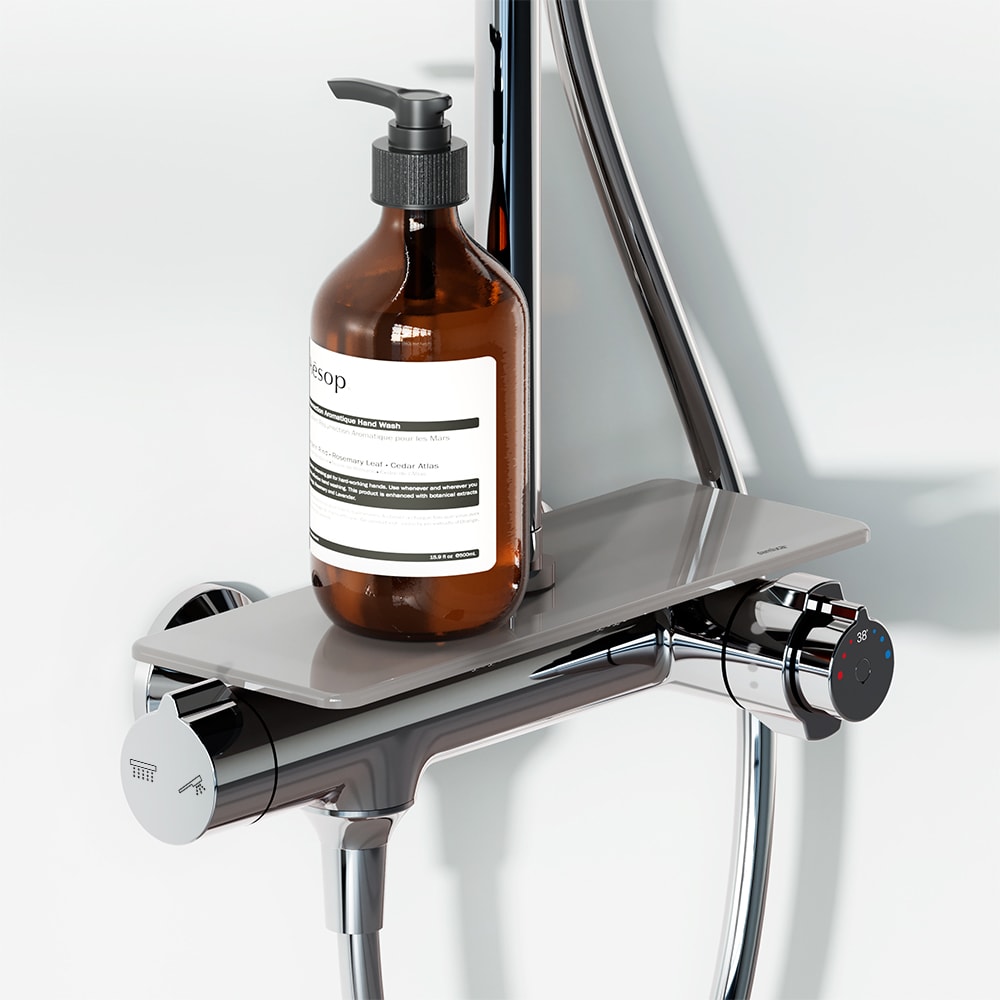 Душевая стойка Damixa Jupiter предлагает непревзойдённый комфорт: смеситель выполнен в виде компактной полочки из закаленного стекла, где удобно хранить все необходимые принадлежности. Телескопическая штанга с диапазоном регулировки 400 мм позволяет настроить высоту душа под любой рост, что делает ежедневные процедуры максимально удобными.
