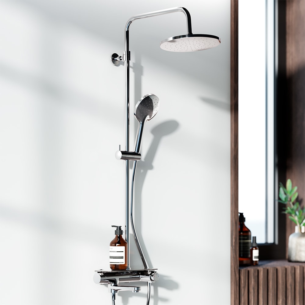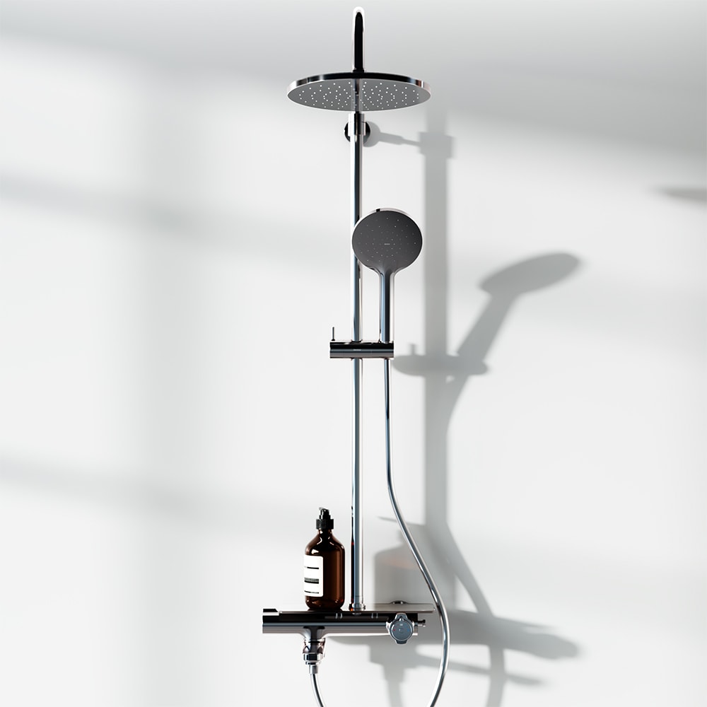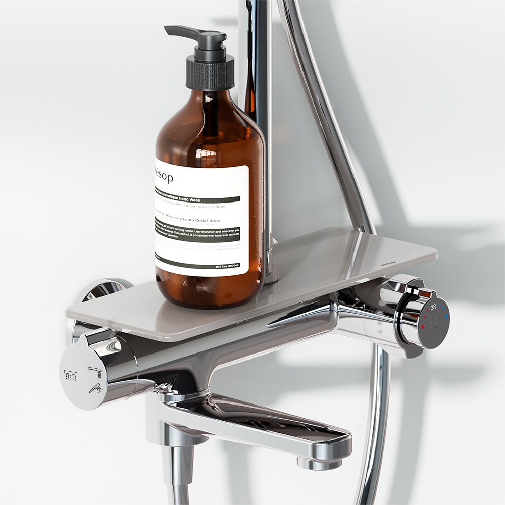 Душевая стойка Damixa Jupiter предлагает непревзойдённый комфорт: смеситель выполнен в виде компактной полочки из закаленного стекла, где удобно хранить все необходимые принадлежности. Телескопическая штанга с диапазоном регулировки 400 мм позволяет настроить высоту душа под любой рост, обеспечивая комфортные условия для всех членов семьи.