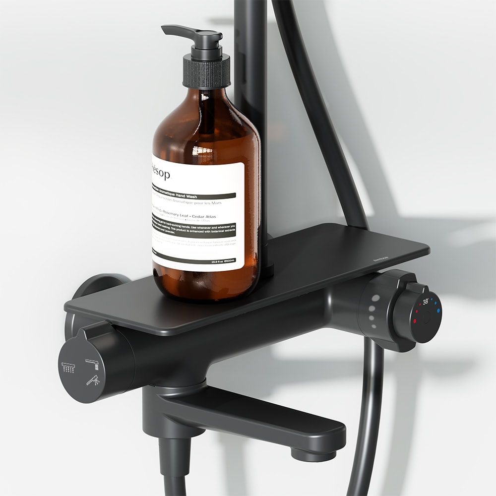 Душевая стойка Damixa Jupiter обеспечивает максимальную безопасность благодаря термостатическому картриджу 35 мм, который позволяет точно настраивать температуру и напор воды. Удобный смеситель в виде компактной полочки из закаленного стекла предоставляет место для хранения необходимых принадлежностей, что добавляет комфорта в повседневные процедуры.