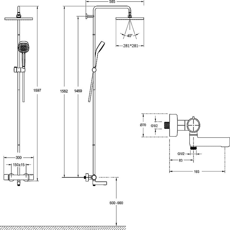 Размер верхнего душа составляет 25 см, что обеспечивает комфортное и равномерное распределение воды. Душевая стойка также комплектуется смесителем и имеет традиционный поворотный излив длиной 19,3 см. Длина шланга составляет 160 см, что позволяет удобно использовать душ в любом положении.
