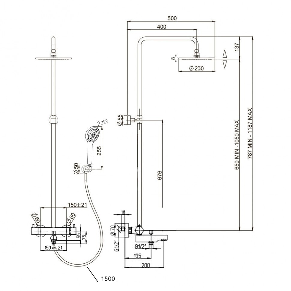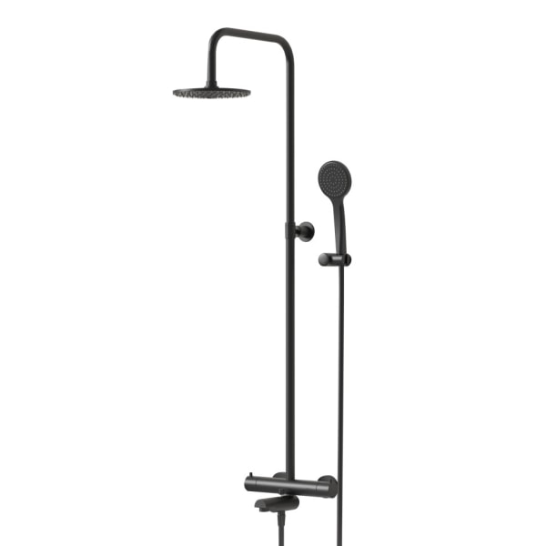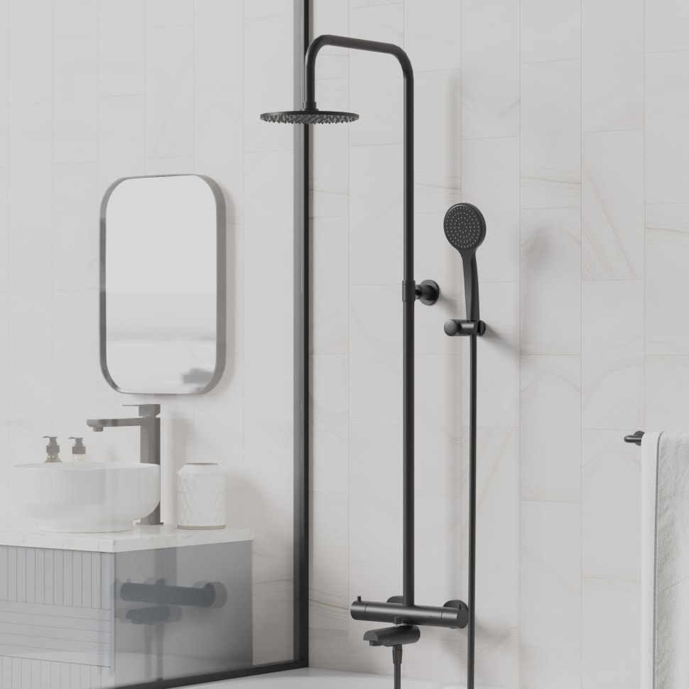 - Термостат с душевой стойкой, верхним душем, душевым комплектом и изливом для максимального комфорта;