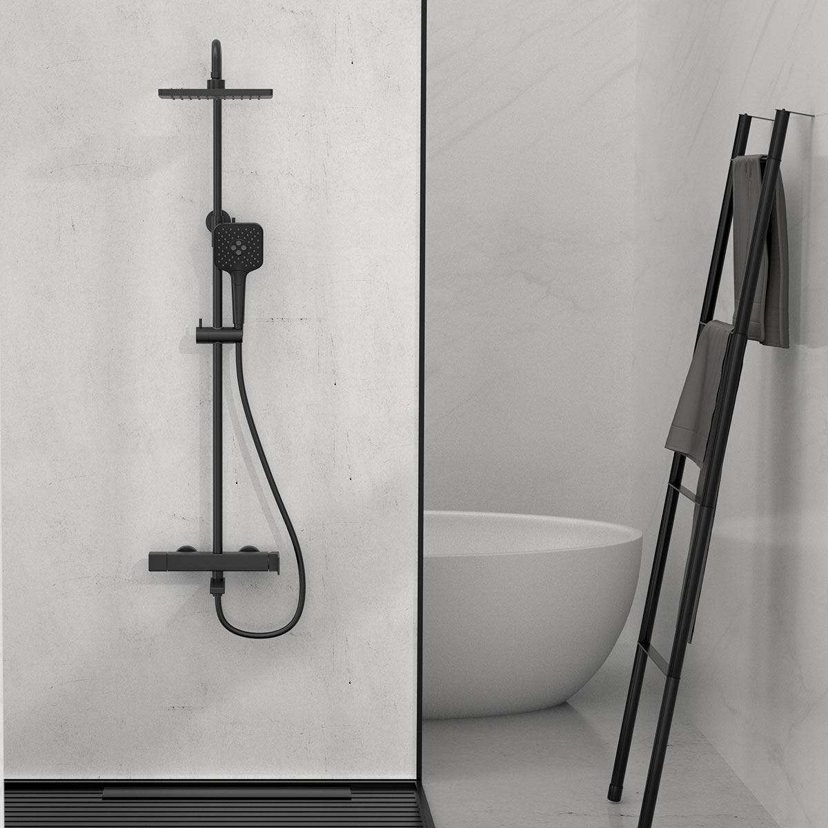 Душевая стойка выполнена из прочной латуни, что обеспечивает долговечность и надежность в эксплуатации. Черный матовый цвет придаёт ей элегантный вид, который легко впишется в любой интерьер. Размеры стойки составляют 1175 мм в высоту, 360 мм в ширину и 309 мм в глубину, что позволяет удобно разместить её в вашей ванной комнате.