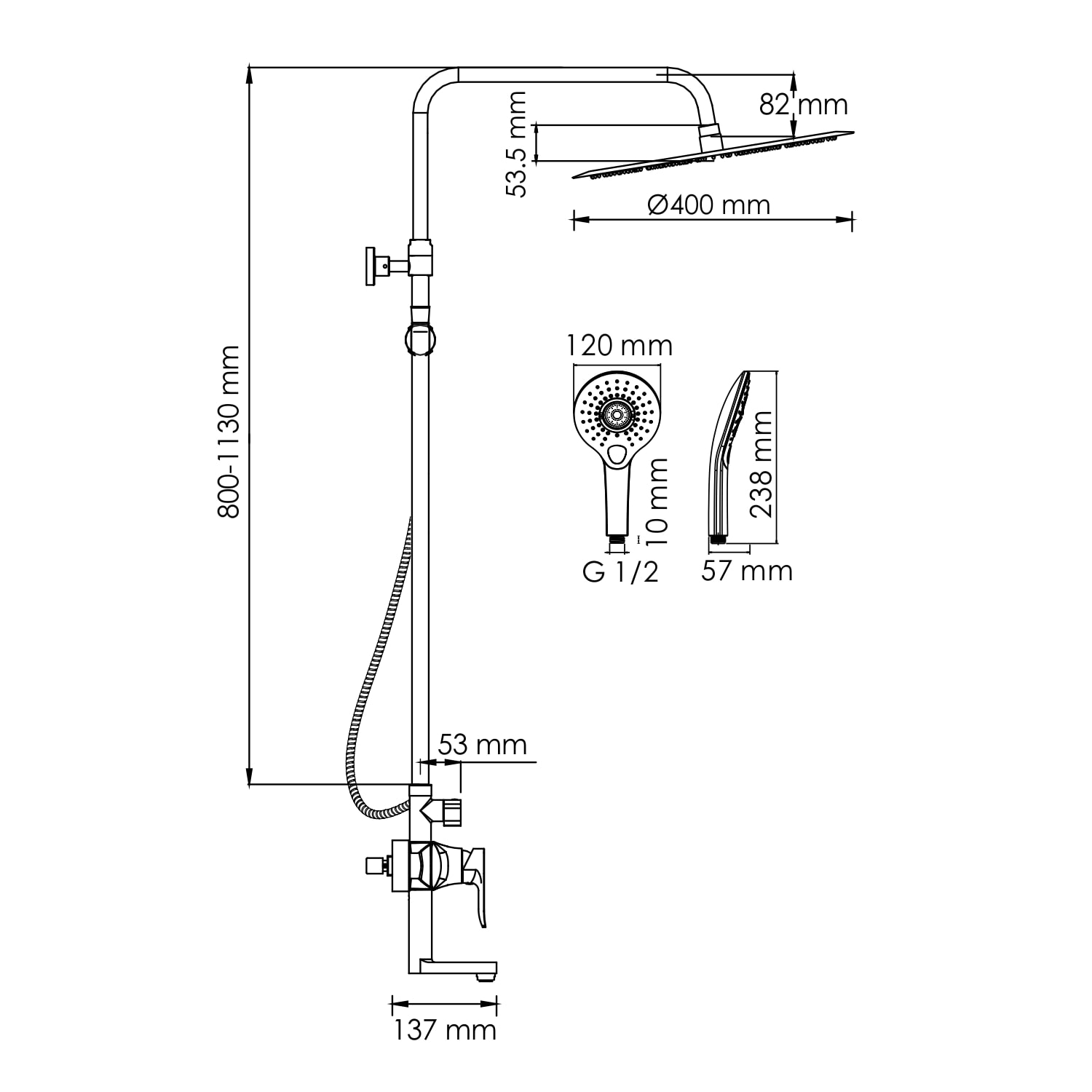 - Регулируемая по высоте душевая штанга: 800-1130 мм