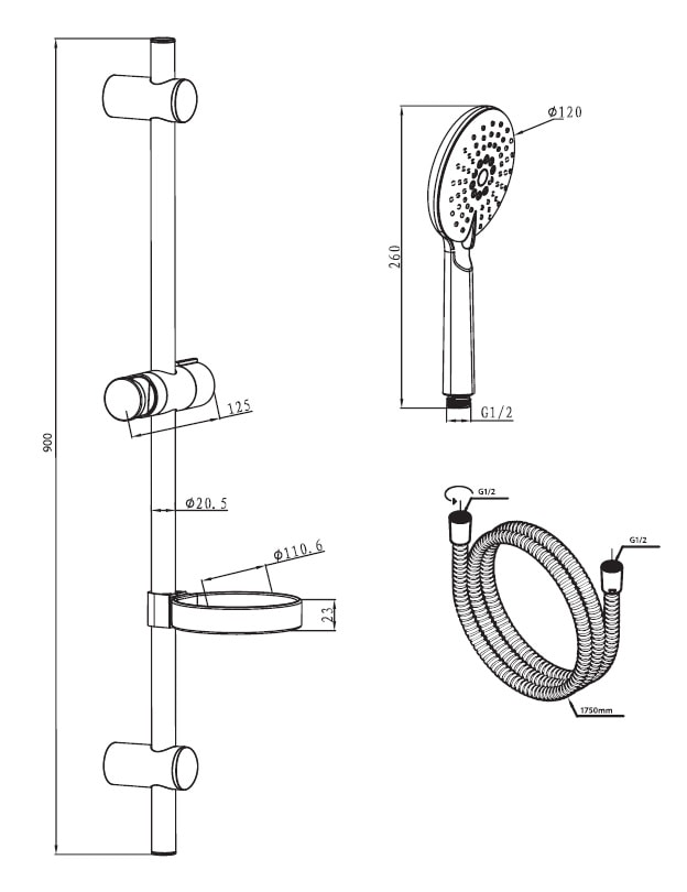 Душевой гарнитур AM.PM Chic выполнен из прочных материалов, таких как латунь и пластик, что обеспечивает долговечность и устойчивость к коррозии. Хромированный цвет придаёт изделию элегантный вид, который легко впишется в любой интерьер. Размеры гарнитура: высота 900 мм, ширина 125 мм и глубина 140 мм, что делает его компактным и удобным в использовании.