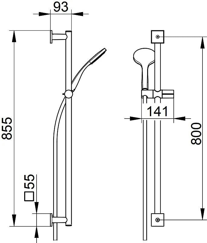 - Длина душевой штанги составляет 855 мм, с расстоянием между отверстиями кронштейна 800 мм.