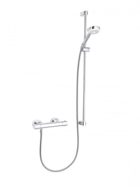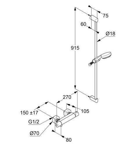 Душевой гарнитур выполнен из прочной латуни и имеет стильное хромированное покрытие, что обеспечивает не только долговечность, но и легкость в уходе. Высота гарнитура составляет 915 мм, что делает его удобным для использования. В комплект входит смеситель с термостатом Kludi Basic, который позволяет точно регулировать температуру воды.