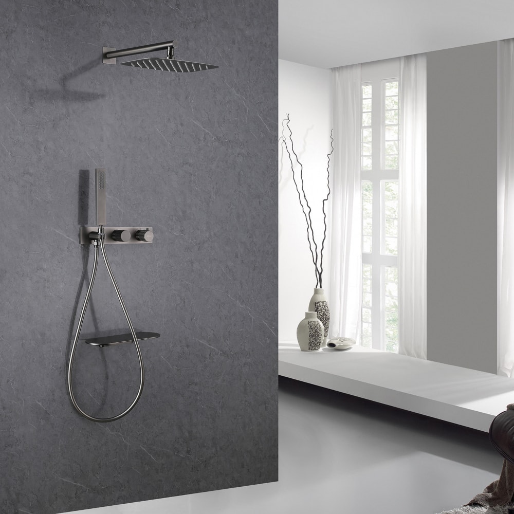 Душевая система скрытого монтажа с изливом и термостатом обеспечивает удобство и простоту в использовании. Цвет никель придаёт комплекту элегантный и современный вид, который легко впишется в любой интерьер. Изготовленный из прочной латуни, этот душевой комплект гарантирует долговечность и надежность в эксплуатации.
