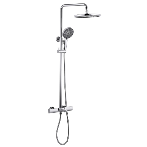 Комплект имеет настенный монтаж и телескопическую конструкцию, что позволяет регулировать высоту от 850 до 1150 мм. Система против известковых отложений обеспечивает долговечность и легкость в уходе за душем.
