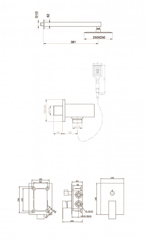 Комплектация: в комплект входит встраиваемый смеситель с переключателем на два выхода, верхний душ диаметром 25 см с изливом, а также ручной душ с тремя режимами работы, шлангом, штуцером и держателем. Это позволяет вам выбрать наиболее удобный способ принятия душа.