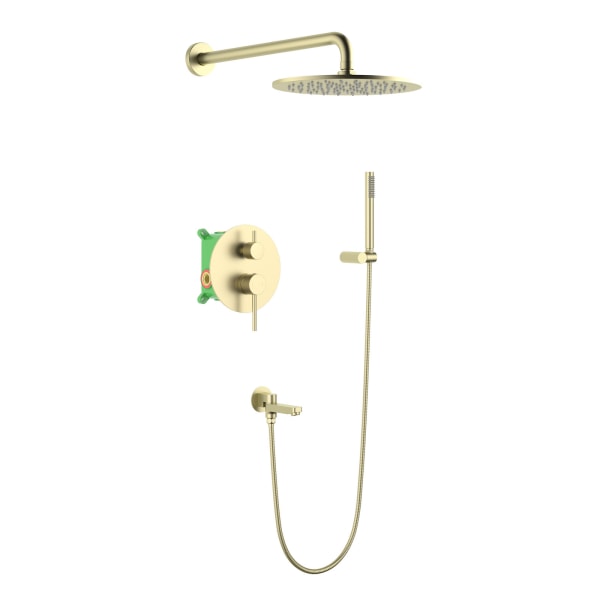 Габариты душевого комплекта составляют 545 мм в глубину, 570 мм в высоту и 375 мм в ширину, что делает его универсальным для установки в любом пространстве. Цвет "матовое золото" никогда не выйдет из моды, подчеркивая ваш утонченный вкус и стиль.