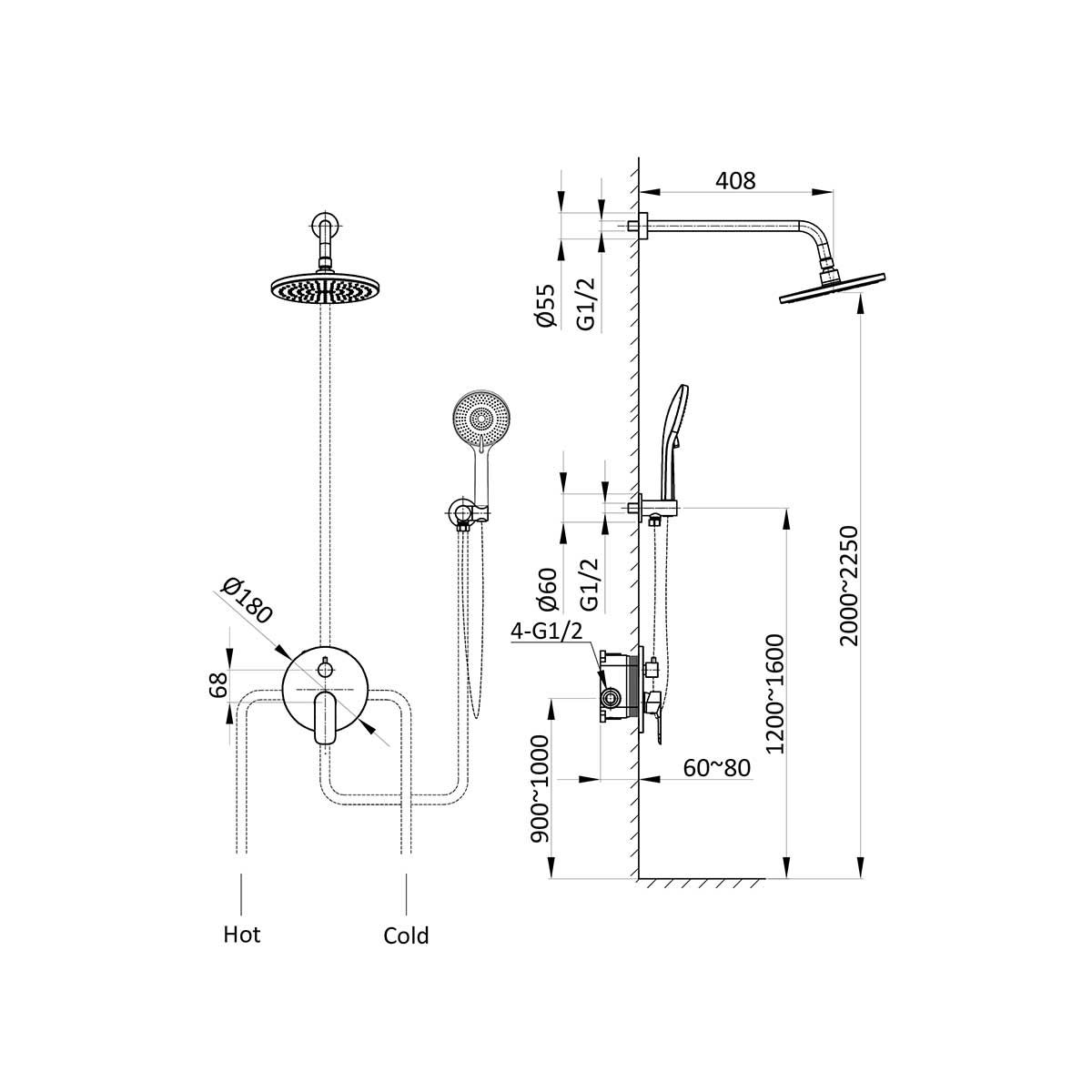 Верхний душ из нержавеющей стали диаметром 255 мм обеспечивает равномерное распределение воды, создавая ощущение настоящего спа. Глубина душевого комплекта составляет 180 мм, высота - 536 мм, а ширина - 255 мм, что делает его компактным и удобным для установки в любом пространстве.