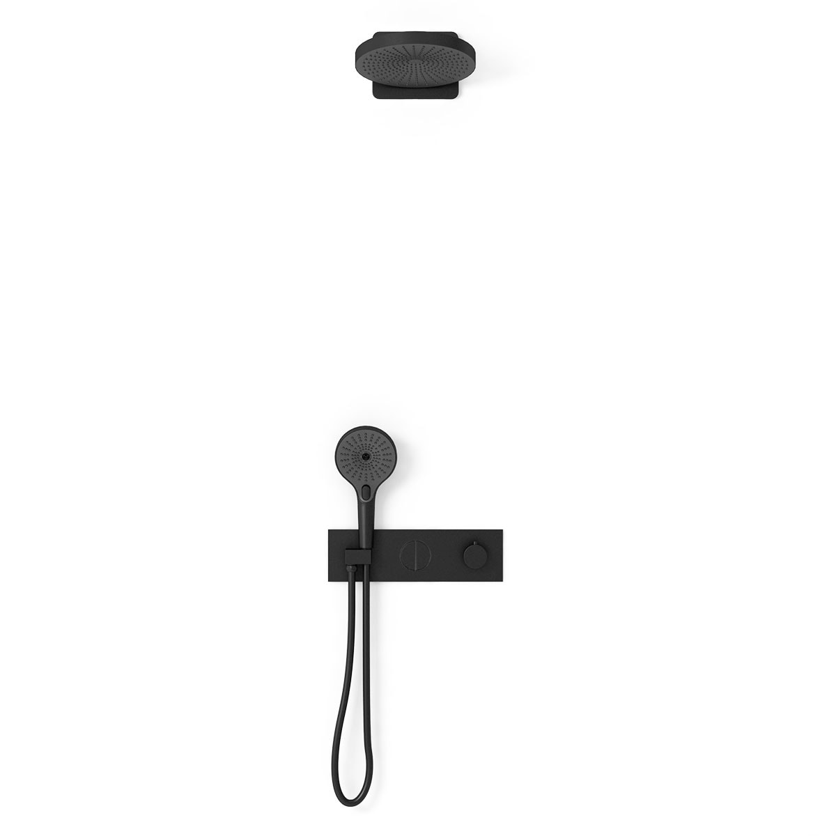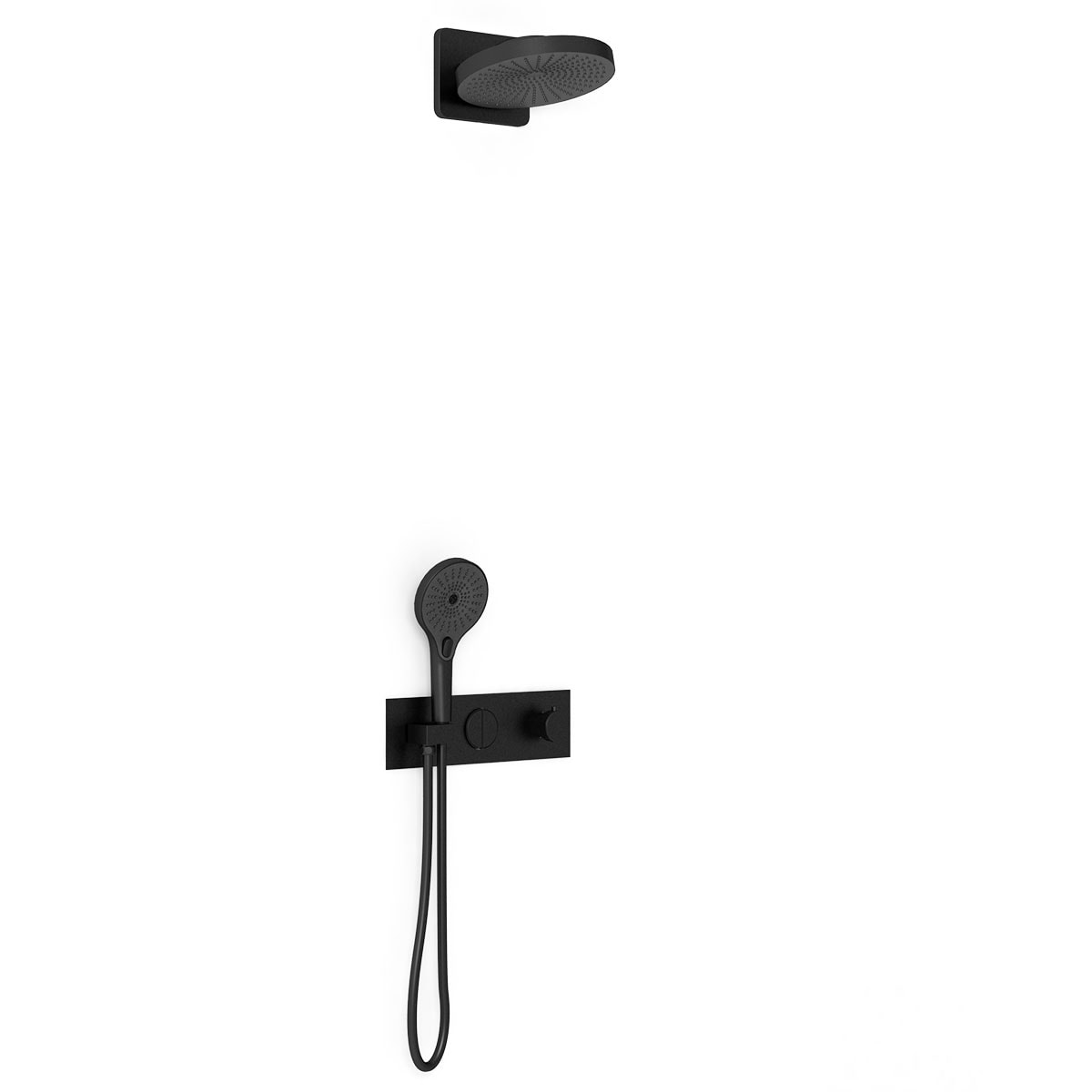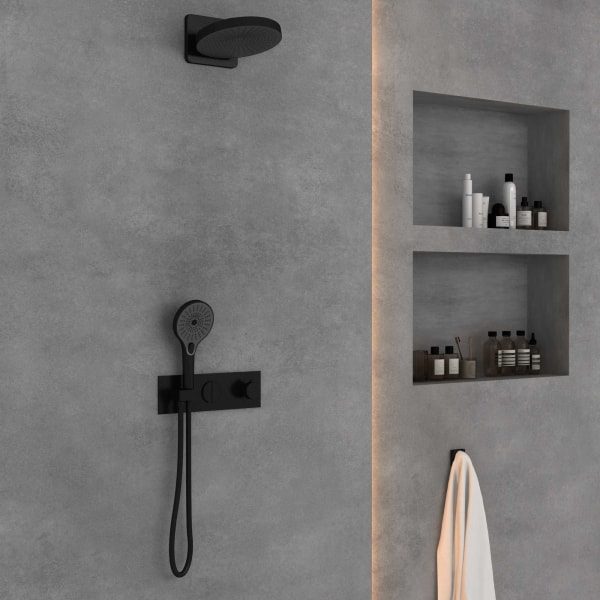 Управление душевым комплектом осуществляется с помощью термостата, что позволяет легко и быстро регулировать температуру воды. Два переключателя потоков обеспечивают удобство в использовании, позволяя выбрать между верхним и ручным душем в зависимости от ваших предпочтений.