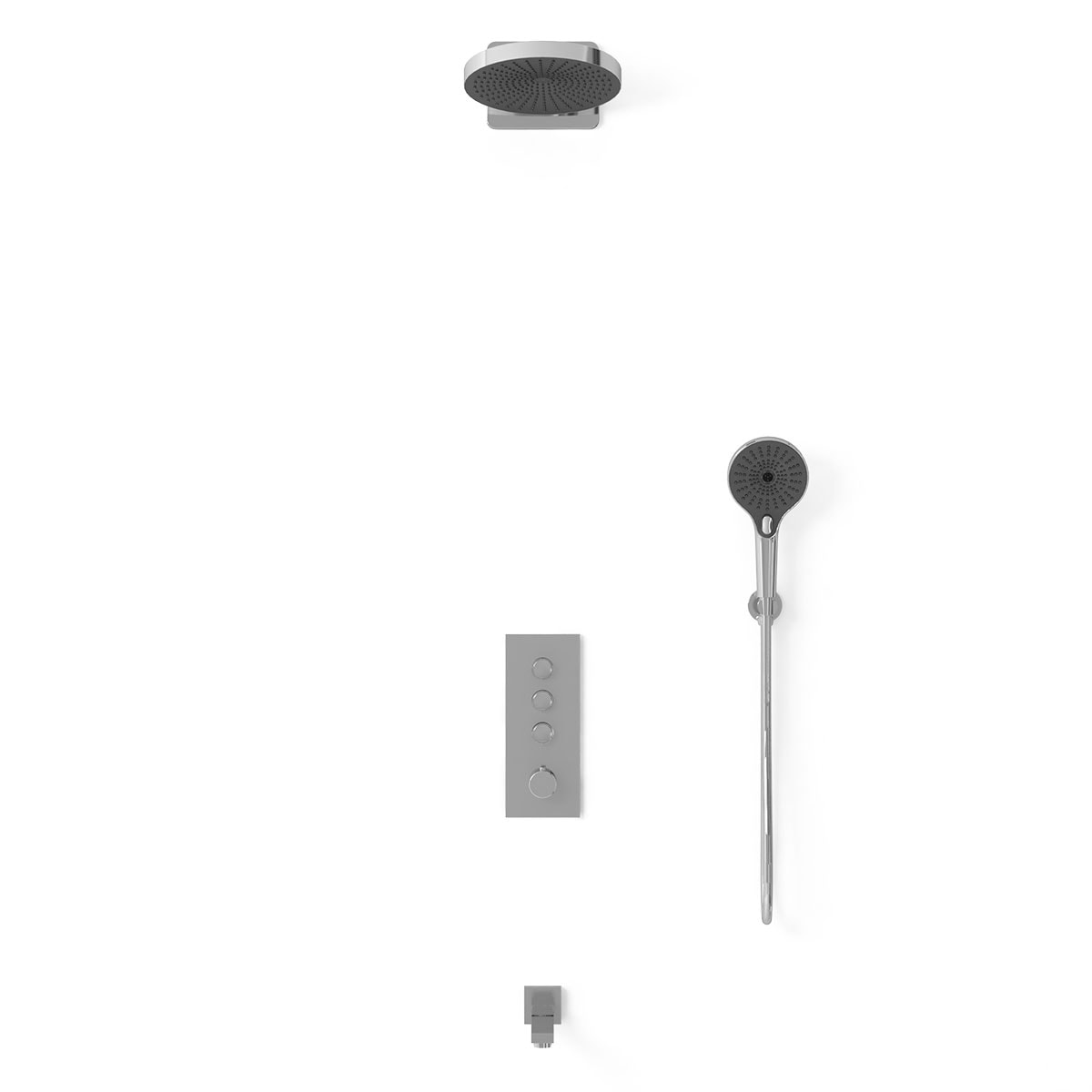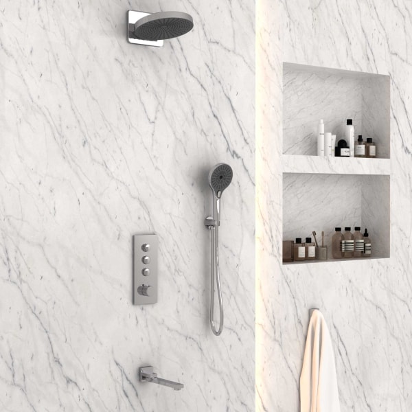 Управление душем осуществляется с помощью термостатического смесителя, что обеспечивает точный контроль температуры воды и комфортное использование. Три режима работы ручного душа позволяют выбрать оптимальный поток воды в зависимости от ваших предпочтений.