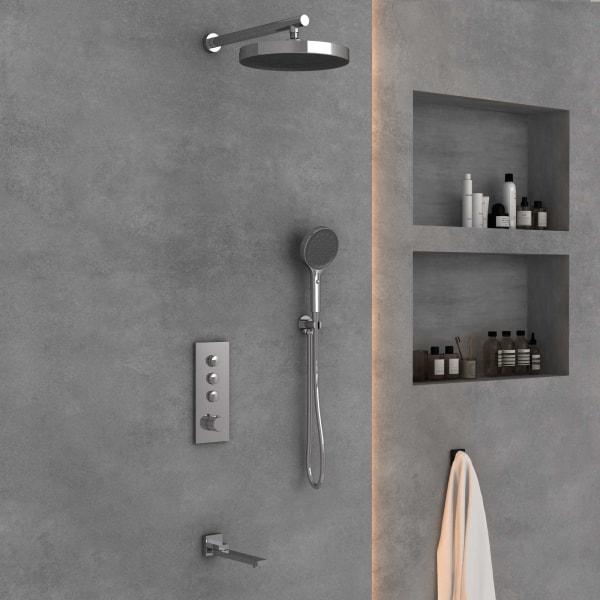 - Комплектация: Верхний душ, держатель ручного душа, ручной душ, встраиваемый смеситель, излив