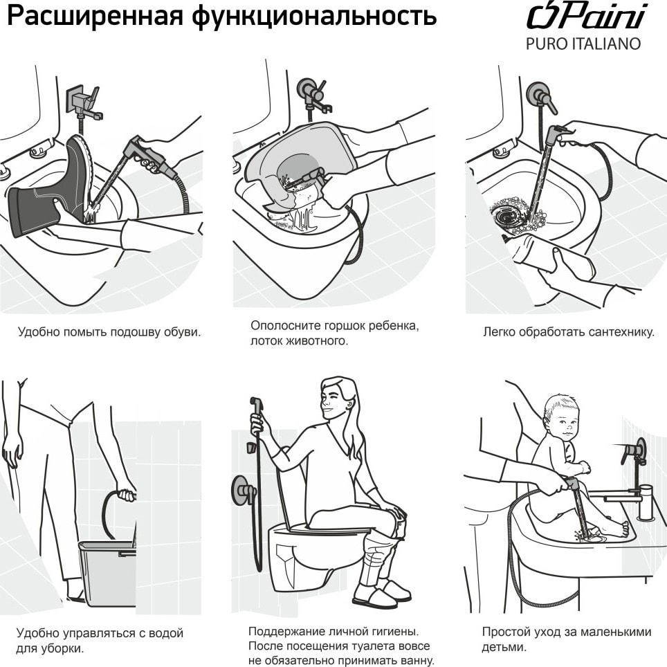 Гигиенический душ Paini Isola ISCR442 - это не только удобство, но и многофункциональность. Он идеально подходит для замены туалетной бумаги, а также может быть использован для: