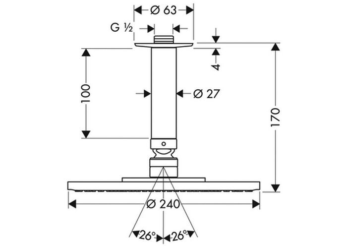 Система потолочного подсоединения 100 мм и защита от люфта обеспечивают надежность и простоту установки. Верхний душ Hansgrohe Raindance Air 27477000 также подходит для проточных водонагревателей, при условии, что напор от смесителя составляет не менее 0,15 МПа.