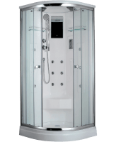 Душевая кабина имеет размеры 1000x1000 мм и выполнена в форме четверти круга, что позволяет эффективно использовать пространство даже в небольших ванных комнатах. Высота кабины составляет 2250 мм, что обеспечивает комфортное использование для людей любого роста.