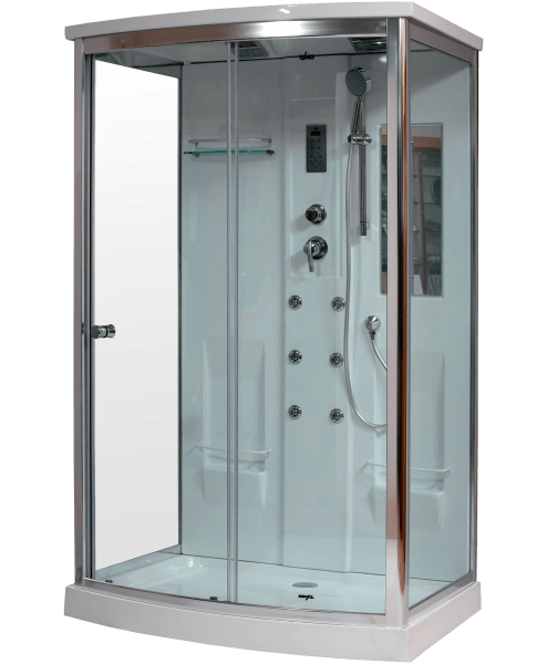 Двери кабины имеют раздвижную конструкцию и выполнены из прозрачного закаленного стекла толщиной 6 мм, что обеспечивает безопасность и стильный внешний вид. Хромированные ролики и ручки из металлической стали добавляют прочности и надежности.