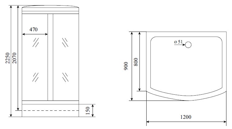 Душевая кабина имеет прямоугольную форму с размерами 1200 мм в ширину и 900 мм в глубину, а высота составляет 2250 мм. Она выполнена в элегантном хромированном цвете, что придаёт ей современный вид и легко вписывается в любой интерьер.