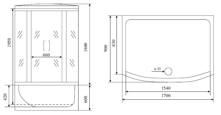 Душевая кабина имеет прямоугольную форму и размеры 1700 мм в ширину, 880 мм в глубину и 2200 мм в высоту, что делает её идеальной для любого пространства. Цвет хрома придаёт ей элегантный вид, а прозрачные двери из закалённого стекла толщиной 6 мм обеспечивают безопасность и долговечность.