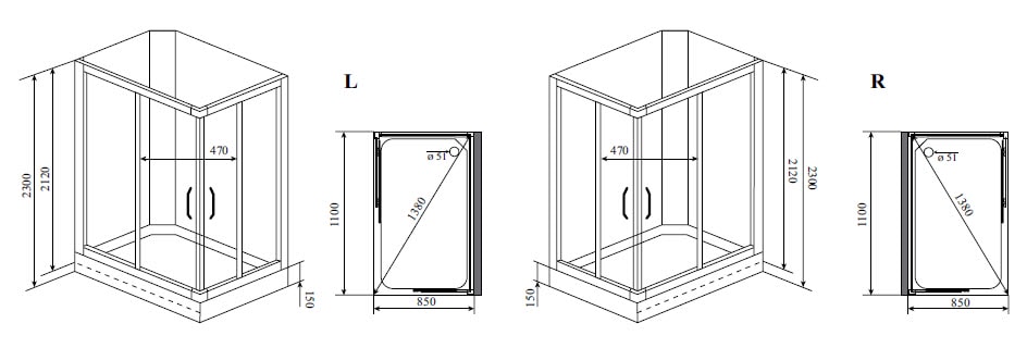 Душевая кабина имеет прямоугольную форму и размеры 1100 мм в ширину и 850 мм в глубину, что позволяет удобно разместиться внутри. Высота кабины составляет 2300 мм, что обеспечивает комфортное использование. Кабина выполнена в элегантном хромированном цвете, который легко впишется в любой интерьер.