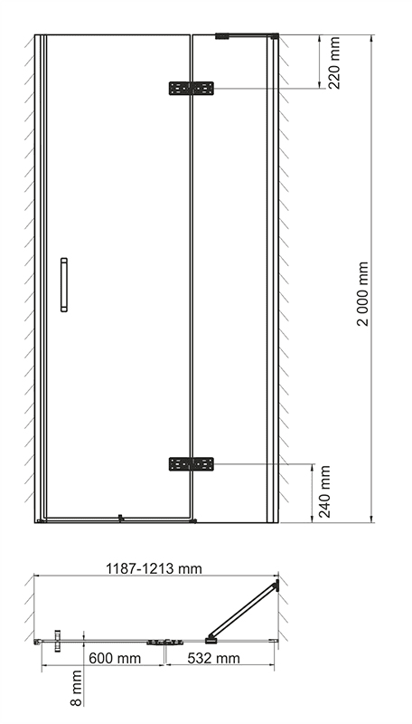 Распашной механизм на прочных латунных петлях гарантирует легкость в использовании, а анодированный алюминиевый профиль шириной 46 мм добавляет дополнительную прочность конструкции. Ручка двери изготовлена из сплава металлов, что обеспечивает надежный захват и долговечность.