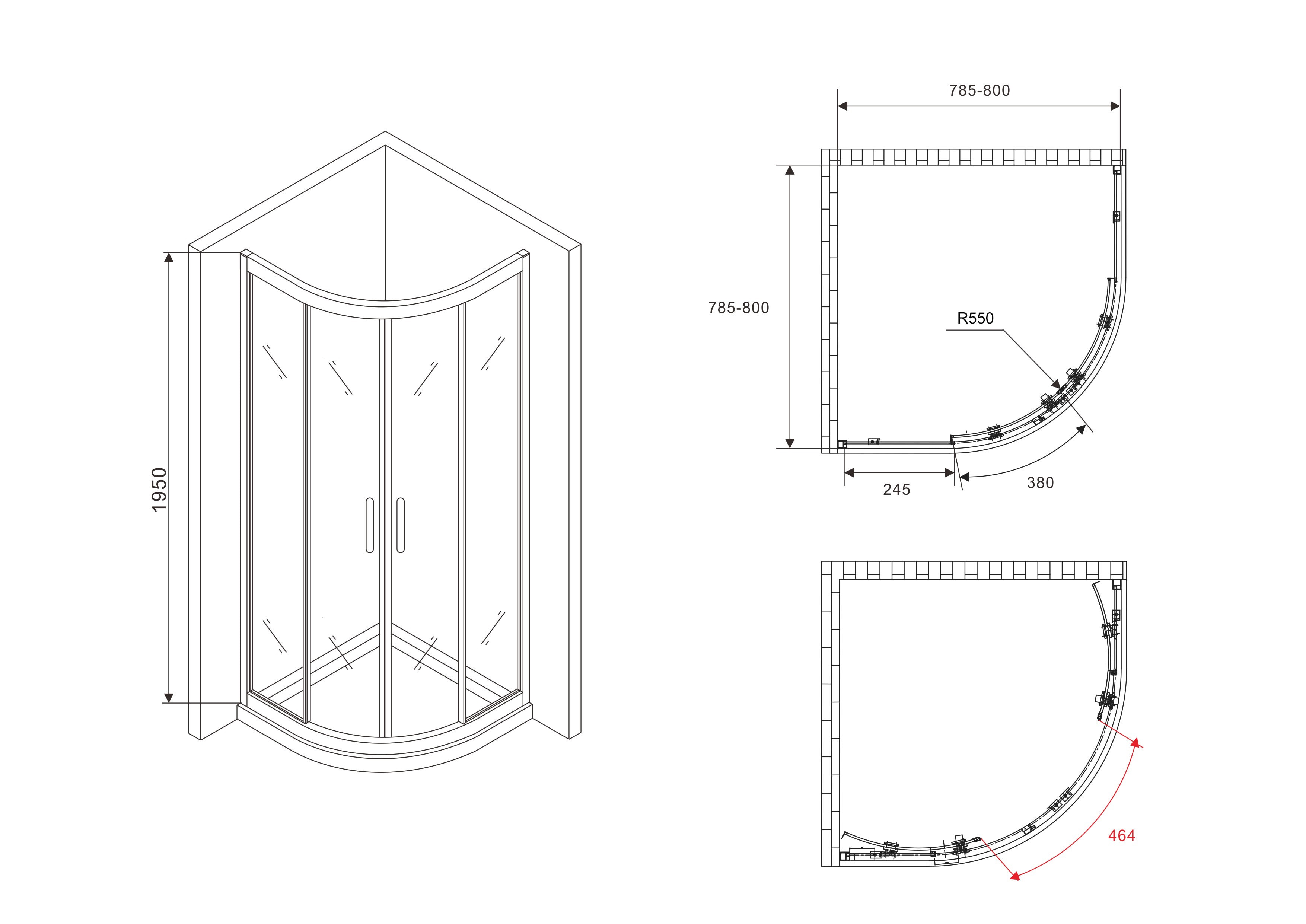 Душевой уголок выполнен из прочного алюминия, что обеспечивает его долговечность и надежность. Высота конструкции составляет 1950 мм, а размеры 80x80 см делают его подходящим для большинства стандартных ванных комнат. Полукруглая форма добавляет элегантности и визуально расширяет пространство, а хромированный цвет придает ему современный вид.