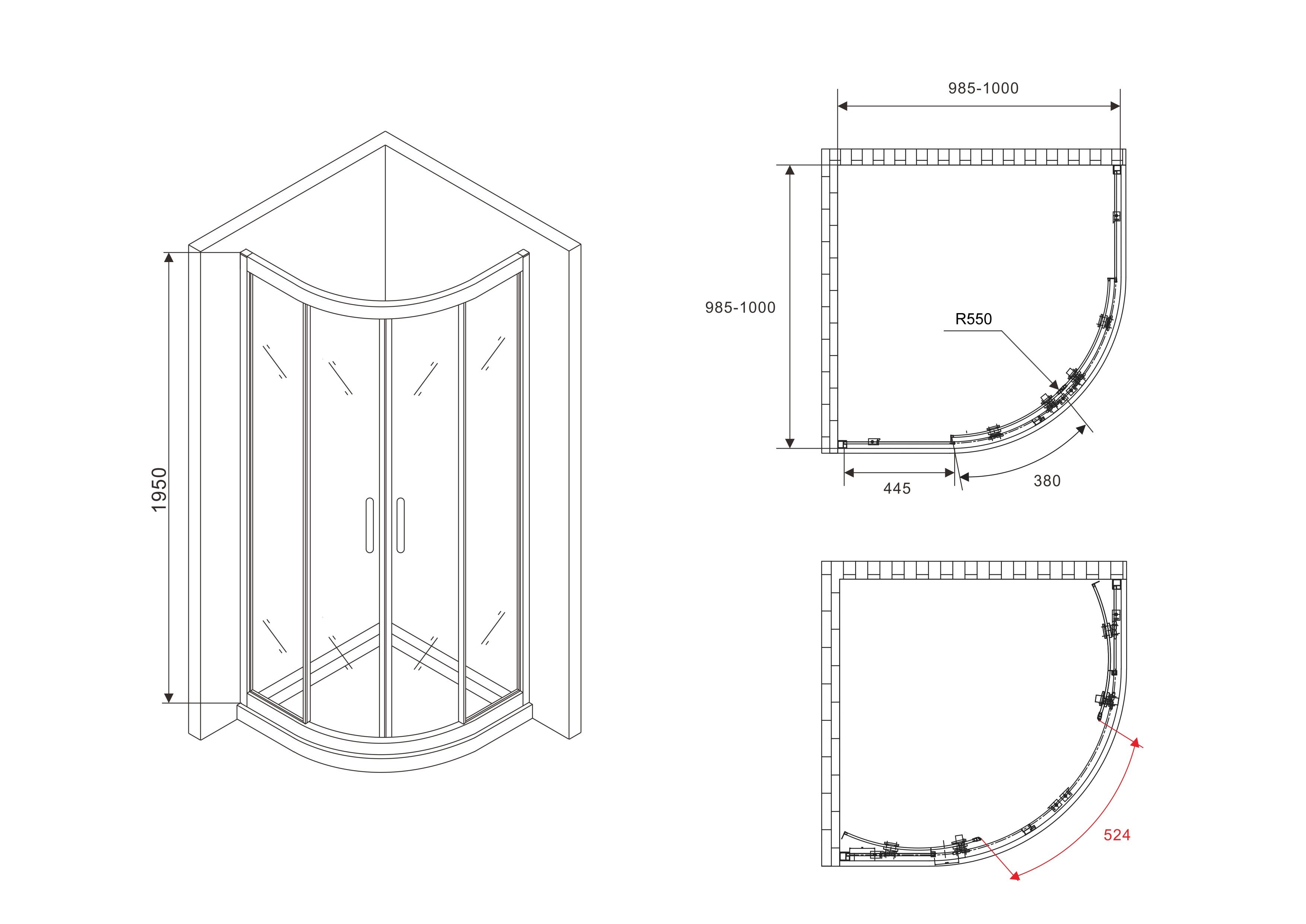 Душевой уголок выполнен из прочного алюминия, что обеспечивает его долговечность и надежность. Высота конструкции составляет 1950 мм, а размеры 100x100 см делают его подходящим для большинства стандартных ванных комнат. Полукруглая форма добавляет элегантности и визуально расширяет пространство, а хромированный цвет придает ему современный вид.
