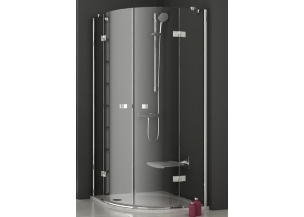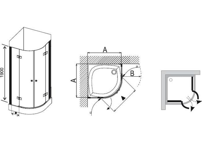 Душевой уголок имеет полукруглую форму и размеры 80x80 см, что делает его подходящим для большинства стандартных ванных комнат. Высота конструкции составляет 190 см, что обеспечивает комфортное использование для людей любого роста. Двери уголка распашные, с двумя створками, которые открываются из центра, что позволяет удобно входить и выходить из душевой зоны.