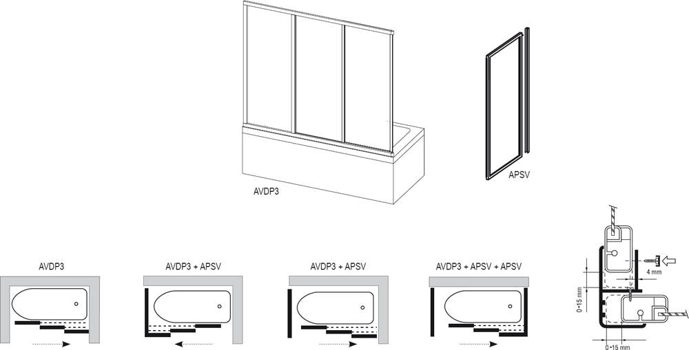 Неподвижная стенка состоит из одной неподвижной части. Конструкция составлена из толстостенных профилей с качественной поверхностью и максимальной герметичностью. Ванная дверь AVDP3 комбинируется вместе с неподвижной стенкой APSV, можно устанавливать на прямоугольные ванны (Praktik N, Classic, Sonata, Campanula II, Vanda II и Lilia) или на какую-либо классическую прямоугольную ванну с ровным передним бортом. Стенка для ванны APSV не монтируется отдельно. Стандартная высота стенки 1370 мм.
