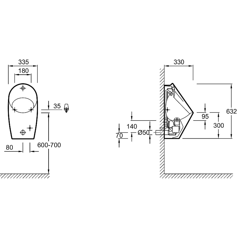 Изготовленный из высококачественного фарфора, писсуар имеет белый цвет, который легко вписывается в любой интерьер. Его размеры: высота - 632 мм, ширина - 335 мм, глубина - 330 мм, что делает его компактным и удобным для установки в ограниченных пространствах.