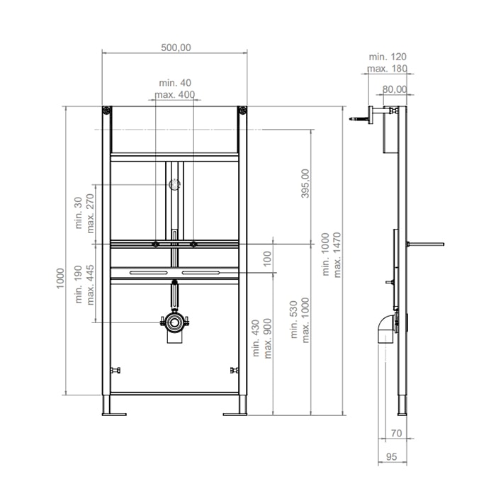 Данная модель инсталляции предназначена для подвесного писсуара и выполнена из прочных материалов: сталь и пластик. Это обеспечивает долговечность и надежность в эксплуатации. Высота инсталляции составляет 1470 мм, ширина — 500 мм, а глубина — 180 мм, что позволяет легко интегрировать её в различные пространства.